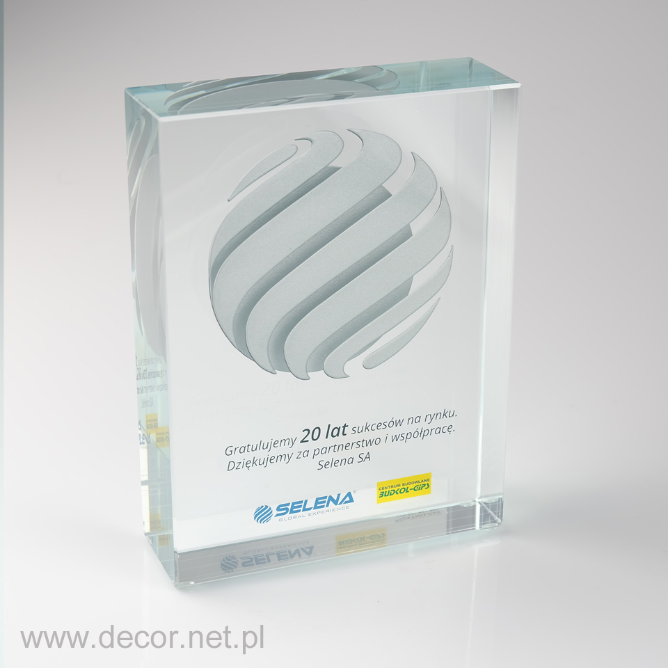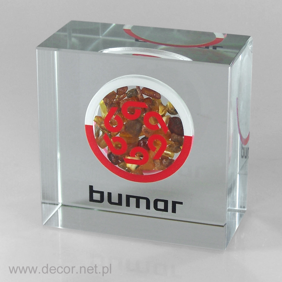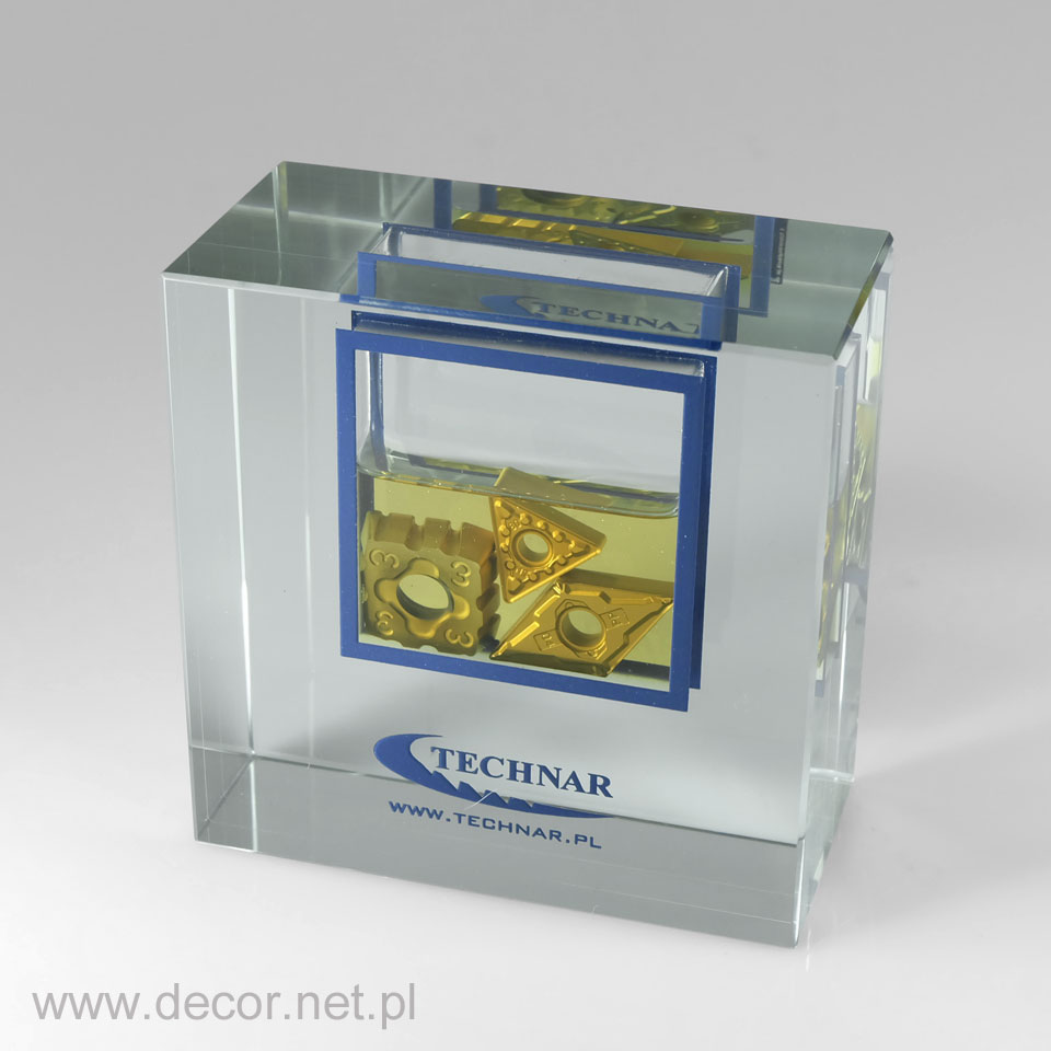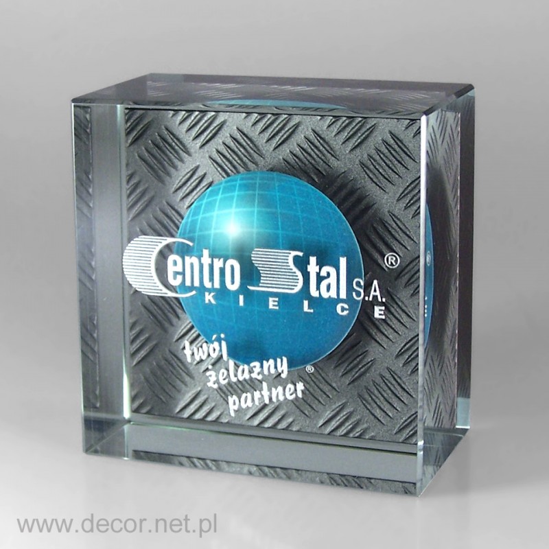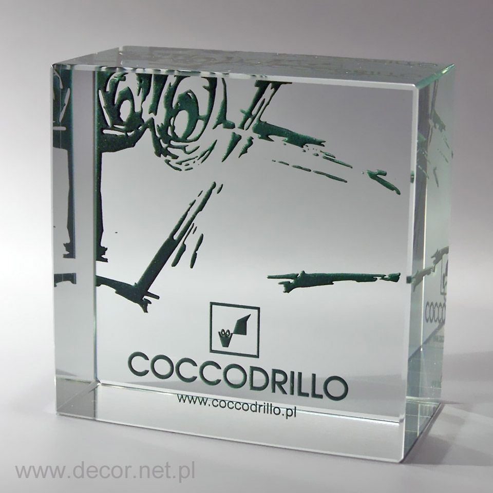 Produkcja szklanych statuetek i gadżetów reklamowych z wykorzystaniem archaicznego grawerunku laserem 3D spowodowałaby rychły koniec tejże branży. Dobra reklama, czy marketing potrzebują czegoś o wiele więcej. Potrzebują koloru i splendoru, unikając półśrodków i oklepanych rozwiązań. Firma Decor wypracowała chronione prawem patentowym możliwości znakowania szkła poprzez wykorzystanie barwionych grawerunków (w wariancie jednokolorowym lub wielobarwnym) oraz fotografii. Zamknięcie w szklanej bryle wieloplanowych aranżacji przestrzennych ma niewątpliwie cechy grawerunku 3D, z tą różnicą, że kolor jest dla nas istotnym elementem kompozycji wpływającym m.in. na poprawę czytelności. Najbardziej charakterystycznymi produktami z grawerem kolorowym i zdjęciem zamkniętym w szkle są przyciski do papieru produkowane najczęściej w rozmiarze 80x80x40mm, oraz statuetki szklane, zwykle w kształcie prostopadłościanu. Wiele firm zwraca się do nas, abyśmy wymyślili dla nich sposób umieszczenia wewnątrz szkła przedmiotów lub surowców wykorzystywanych przez ich branżę. Jako jedyni w Polsce spełniamy te marzenia. Zamykamy w szkle karty kredytowe, elektronikę, monety, odznaczenia, ale i również ciecze, kruszywa, ziemię, i wiele więcej.