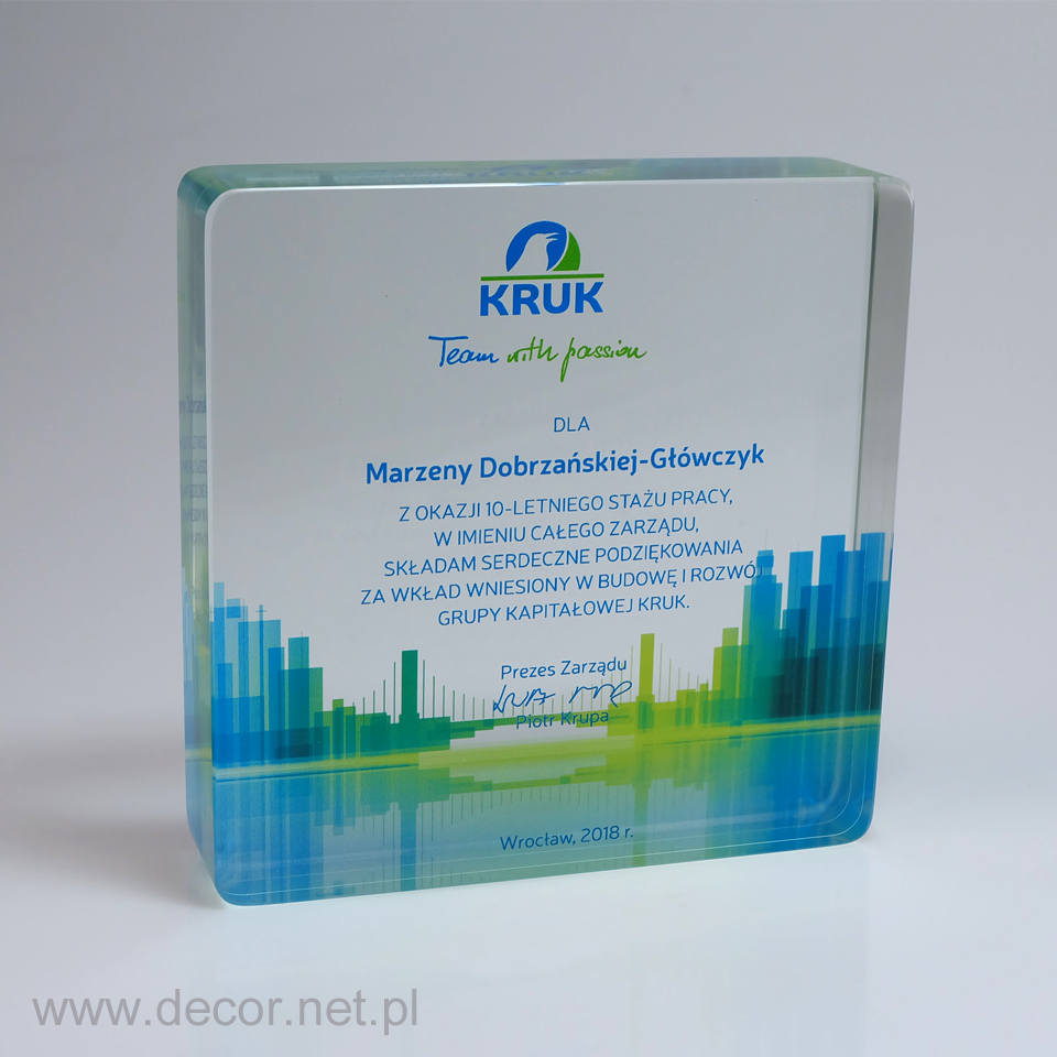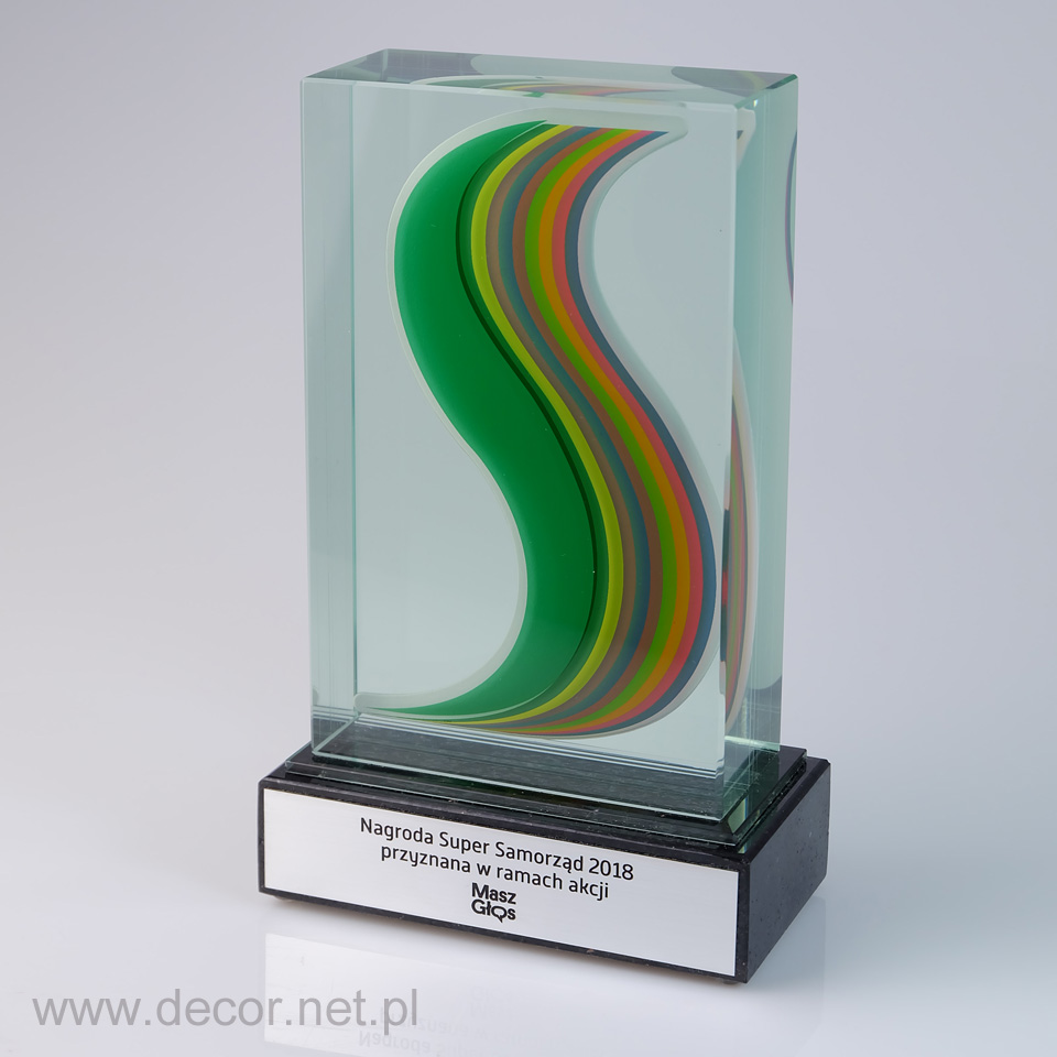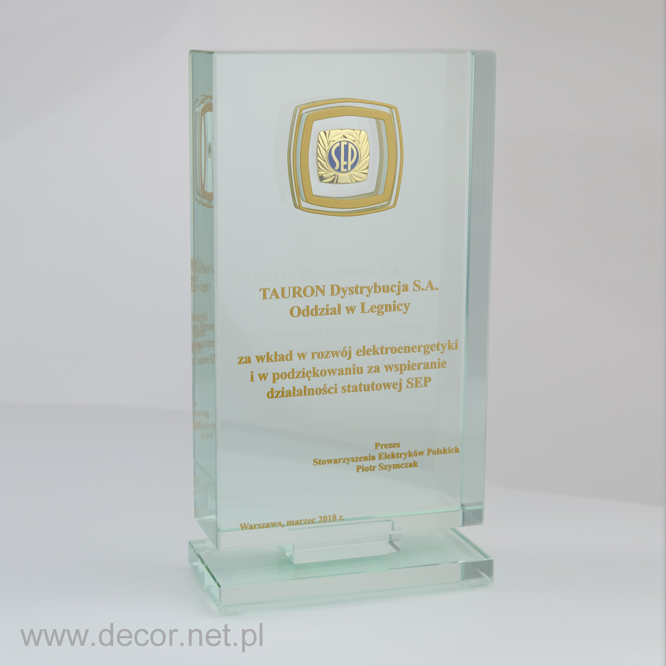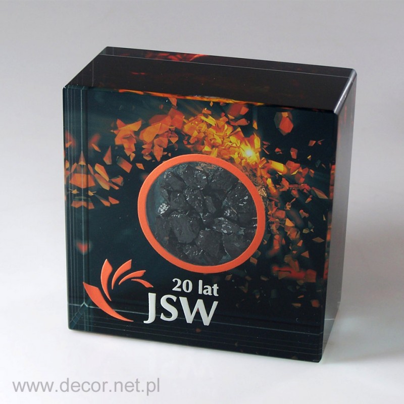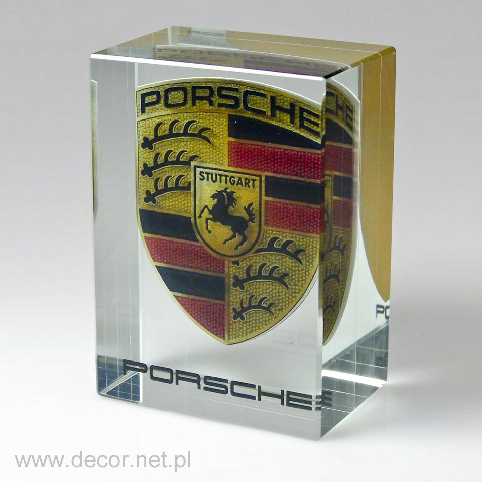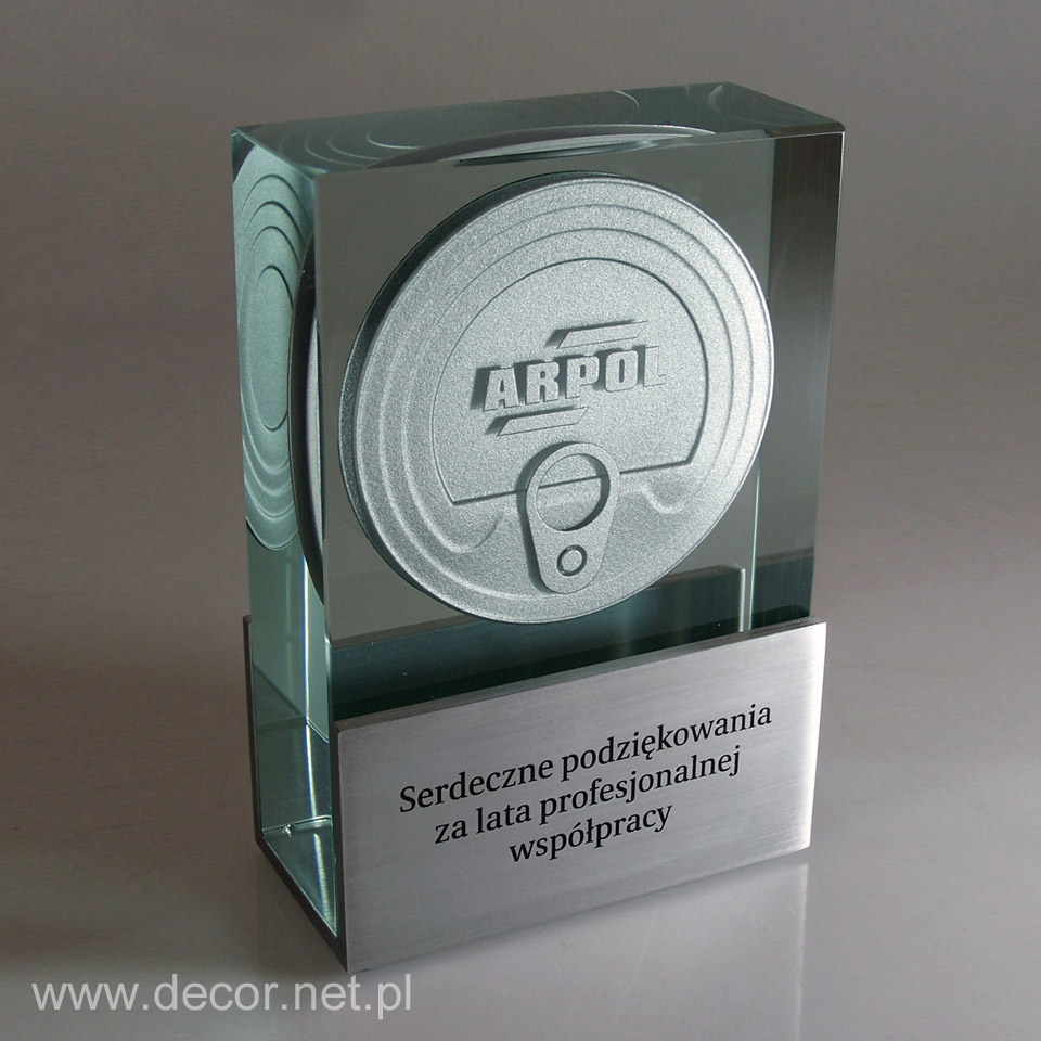 Produkcja szklanych statuetek i gadżetów reklamowych z wykorzystaniem archaicznego grawerunku laserem 3D spowodowałaby rychły koniec tejże branży. Dobra reklama, czy marketing potrzebują czegoś o wiele więcej. Potrzebują koloru i splendoru, unikając półśrodków i oklepanych rozwiązań. Firma Decor wypracowała chronione prawem patentowym możliwości znakowania szkła poprzez wykorzystanie barwionych grawerunków (w wariancie jednokolorowym lub wielobarwnym) oraz fotografii. Zamknięcie w szklanej bryle wieloplanowych aranżacji przestrzennych ma niewątpliwie cechy grawerunku 3D, z tą różnicą, że kolor jest dla nas istotnym elementem kompozycji wpływającym m.in. na poprawę czytelności. Najbardziej charakterystycznymi produktami z grawerem kolorowym i zdjęciem zamkniętym w szkle są przyciski do papieru produkowane najczęściej w rozmiarze 80x80x40mm, oraz statuetki szklane, zwykle w kształcie prostopadłościanu. Wiele firm zwraca się do nas, abyśmy wymyślili dla nich sposób umieszczenia wewnątrz szkła przedmiotów lub surowców wykorzystywanych przez ich branżę. Jako jedyni w Polsce spełniamy te marzenia. Zamykamy w szkle karty kredytowe, elektronikę, monety, odznaczenia, ale i również ciecze, kruszywa, ziemię, i wiele więcej.