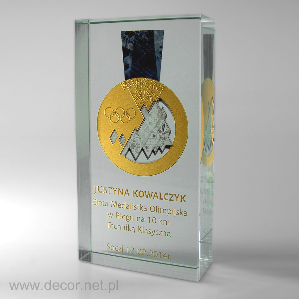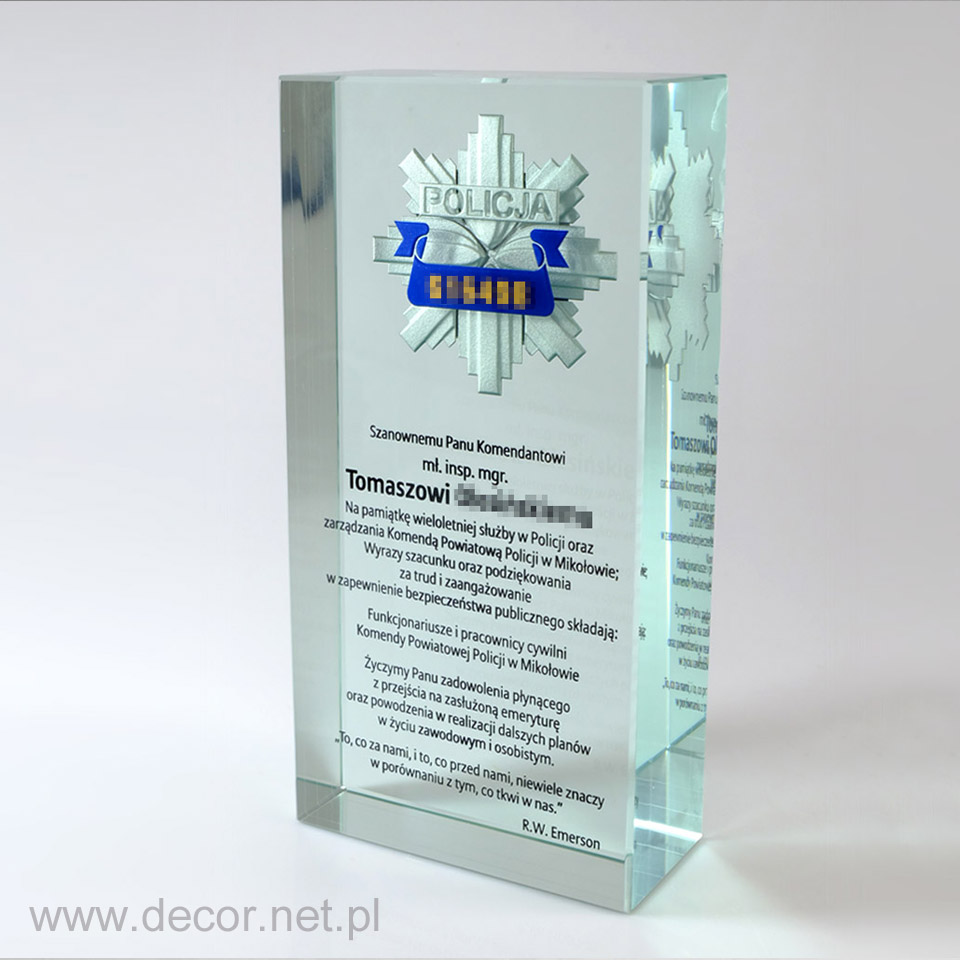 Statuetki i bryły szklane z barwionym grawerem i wydrukiem wewnątrz szkła